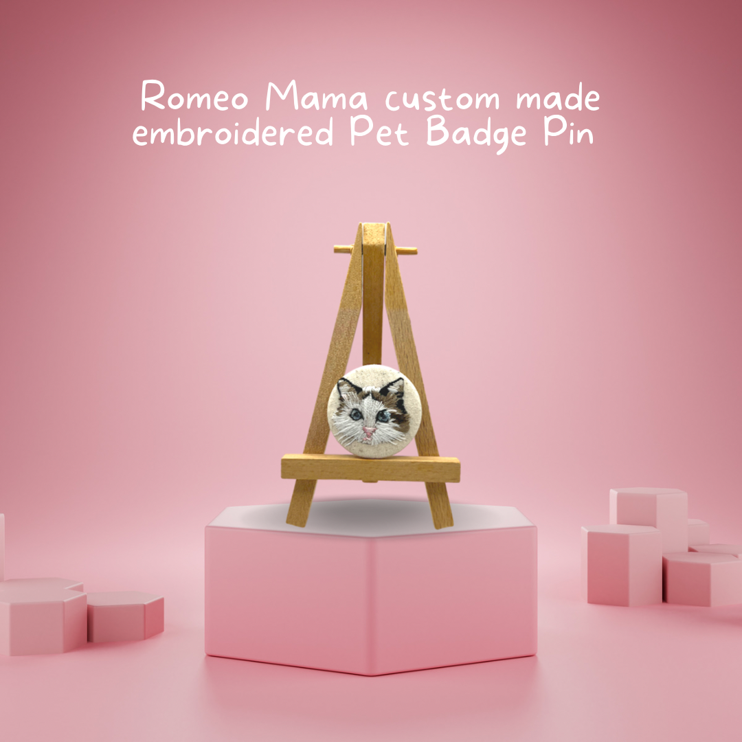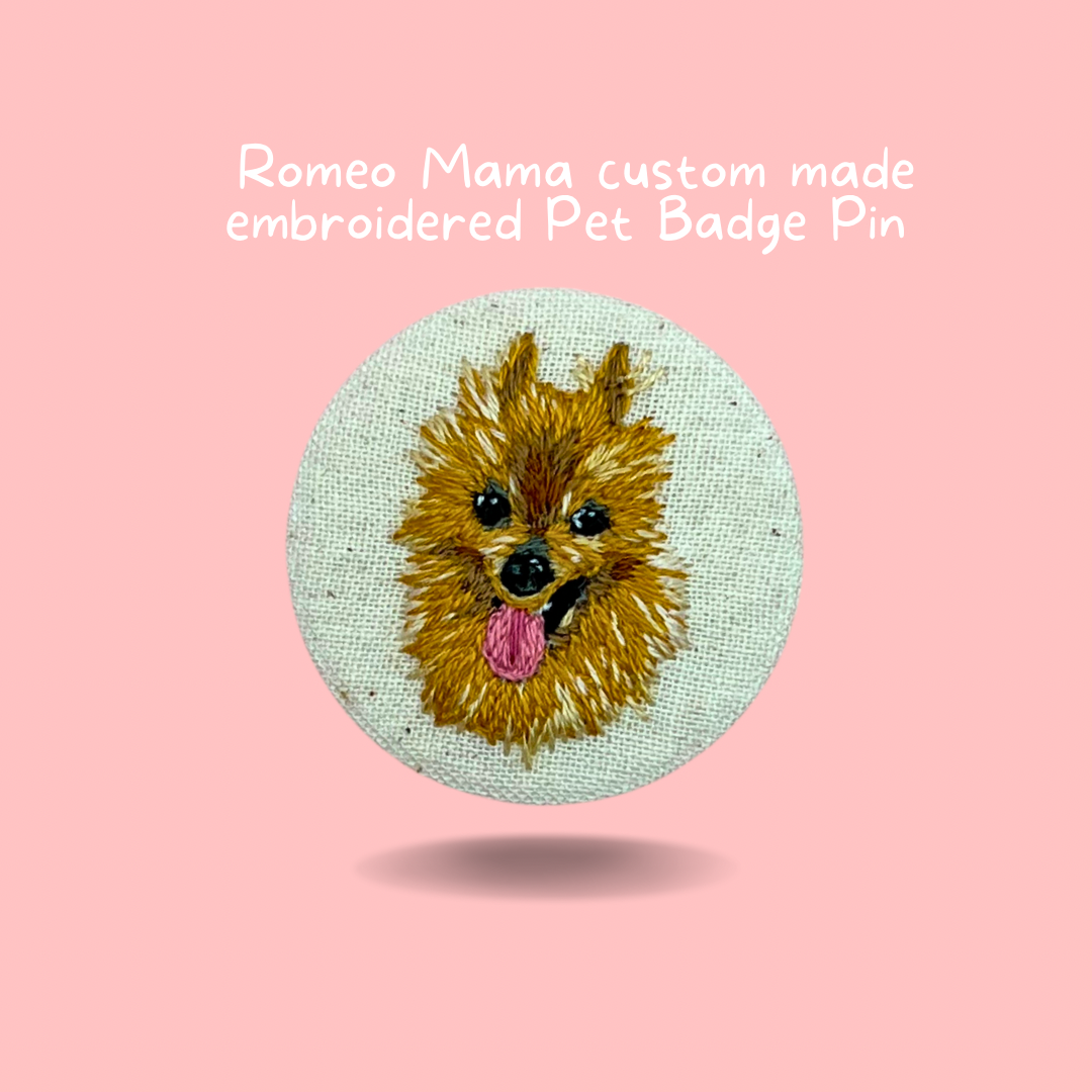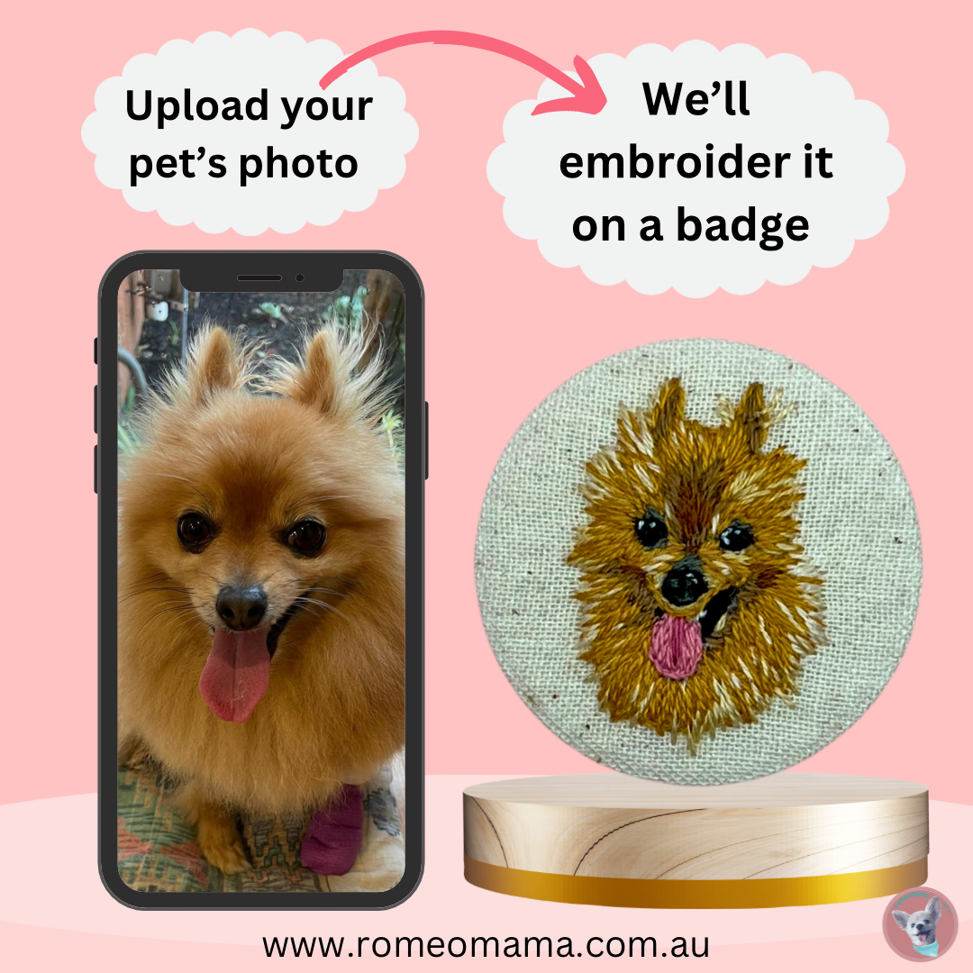 Handcrafted Pet Badge Brooch. Upload your favourite photo of your Fur-Baby and we will embroider their face onto a Badge. Not a print on, we embroider the pet face thread by thread by hand. It is a unique collectable piece and fashioning the Badge Pin on jackets, bags and hats. The ideal accessory for pet lovers.