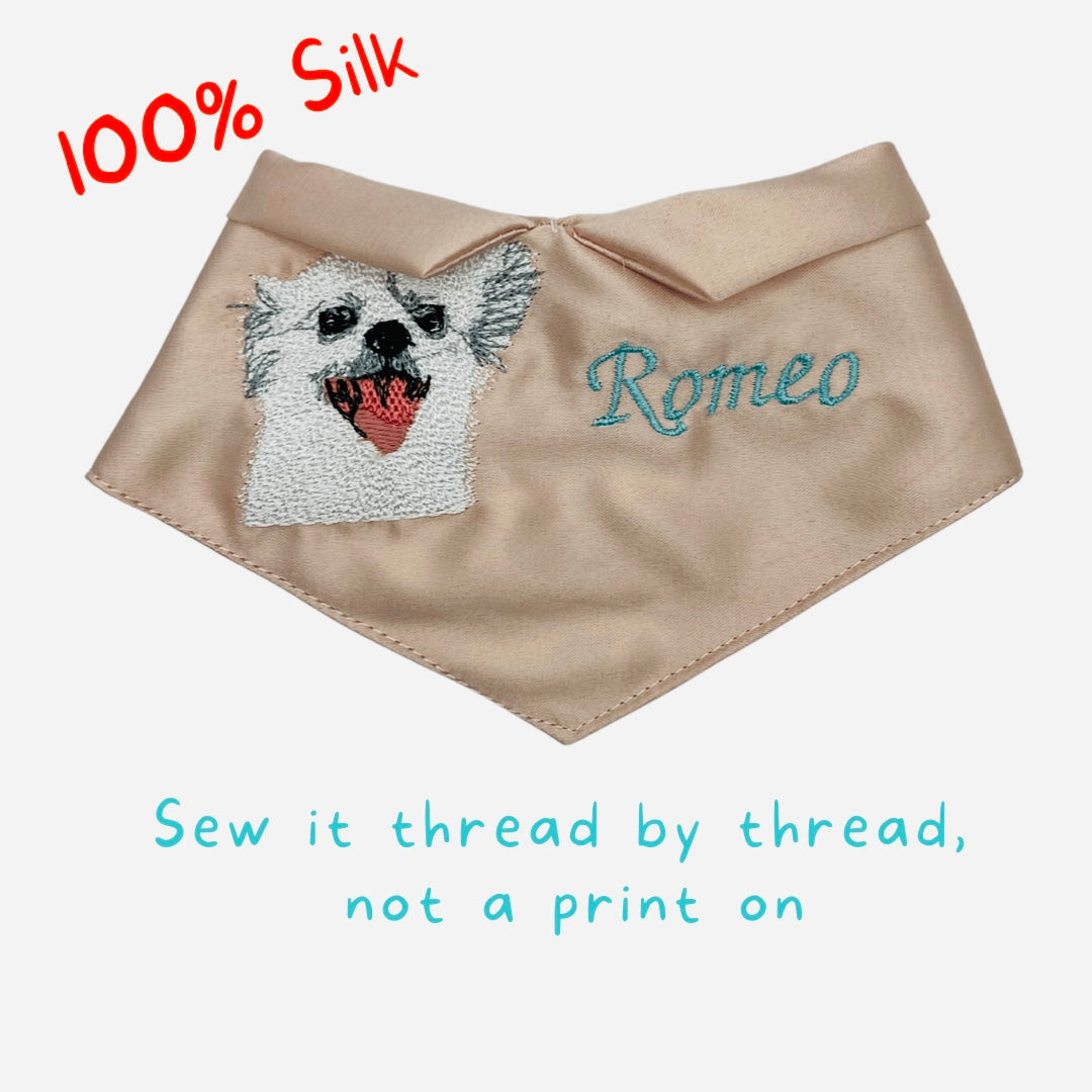 Simply upload your favourite photo of your Fur-Baby and we'll embroider their face and name onto a 100% Silk Bandana. It is NOT those ordinary print-your-photo on bandana.