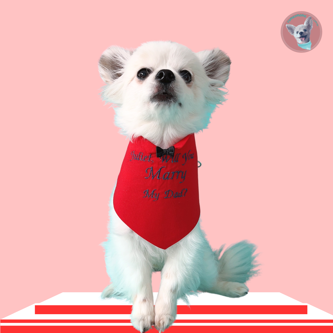 Introducing our custom-made "Will You Marry My Dad?" bandana, the perfect way to involve your furry best friend in your proposal plan! Our bandana is designed to fit comfortably around your pup's neck and feature the heartwarming question, "Will you marry my Dad?" embroidered in a romantic way to guarantee the ANSWER is "YES, I DO"