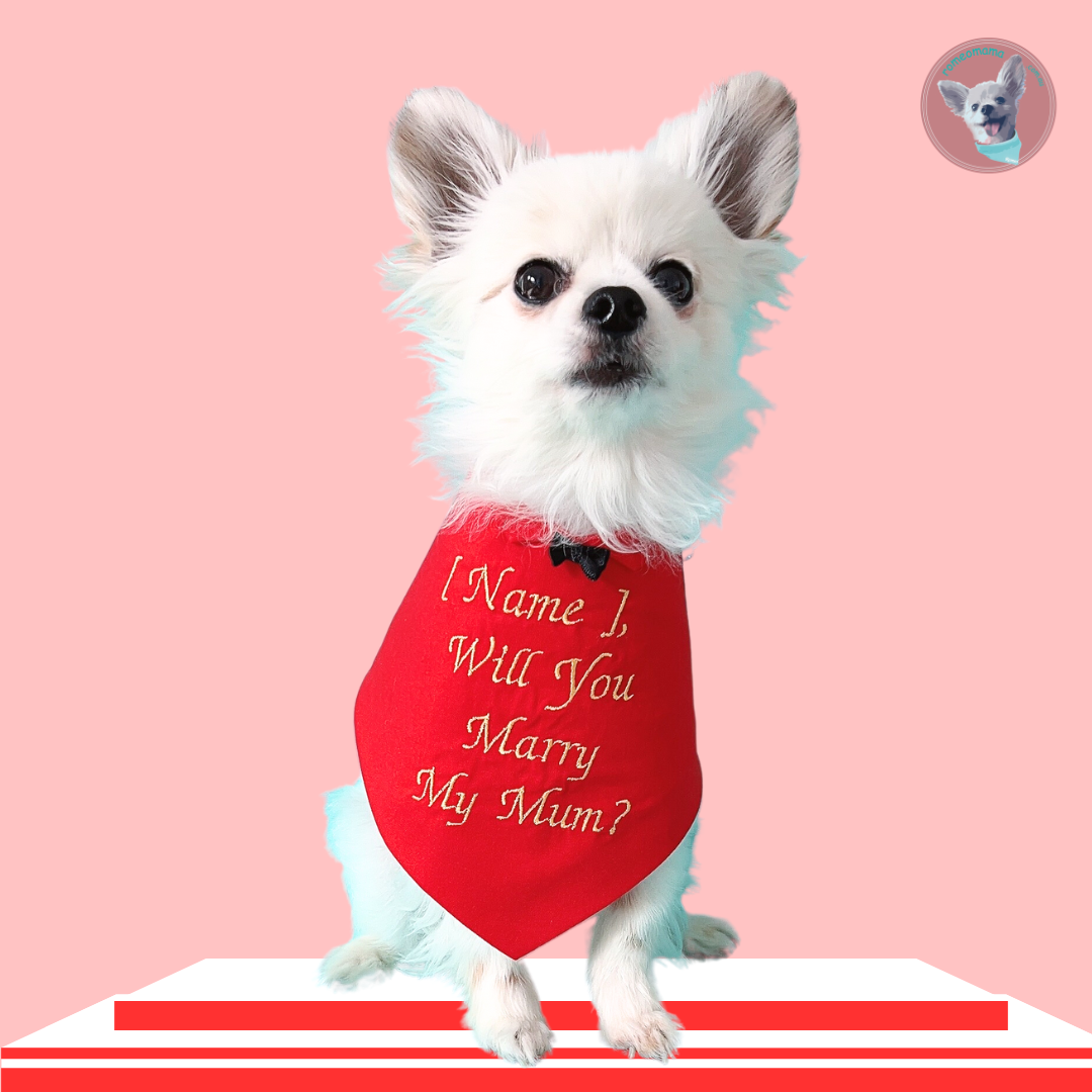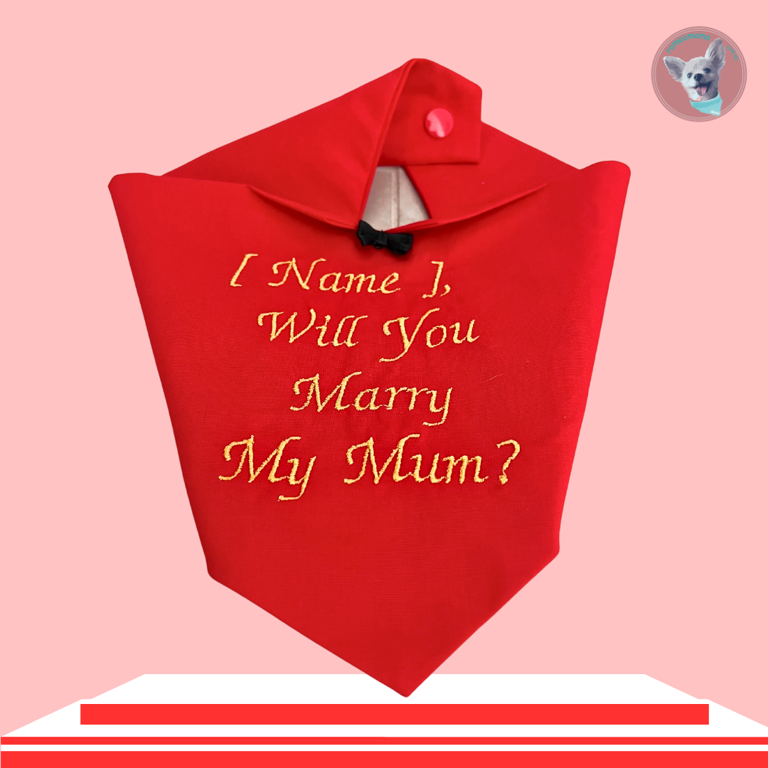 Are you looking for a way to propose to your partner with a little help from your Fur-Baby or just want to add a great conversation starter, the "Will You Marry My Mum" dog bandana is the perfect accessory.